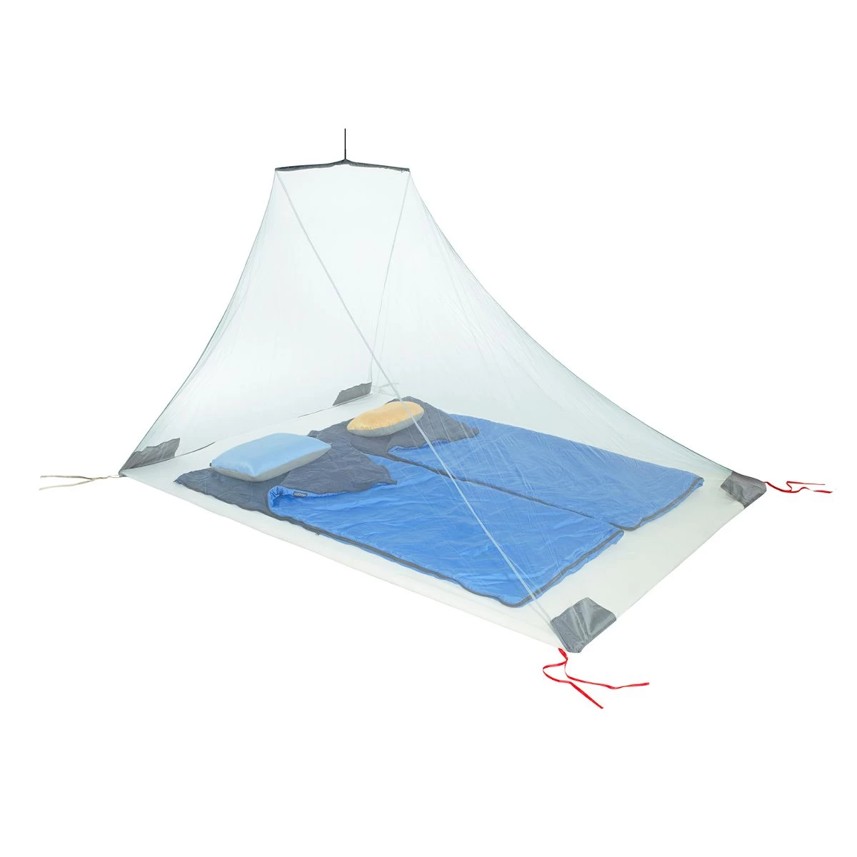 Outdoor net for two people. 100% fine and lightweight polyester. Features: colored tie loops in corners and at peak, rock pockets in each corner, and a specially designed compression stuff sack. Double features lightweight shock-corded fiberglass poles that spread the net.