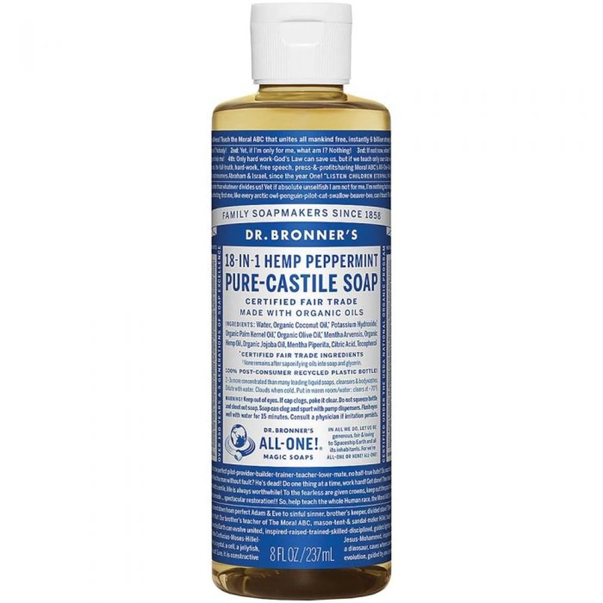Dr. Bronner’s Peppermint soap is biodegradable, vegetable based and made with Certified Fair Trade and Organic Oils. The peppermint essential oils tingle the body and clear the mid. Because therapeutically peppermint oil is a mild stimulant, it can increase vitality and clarity.