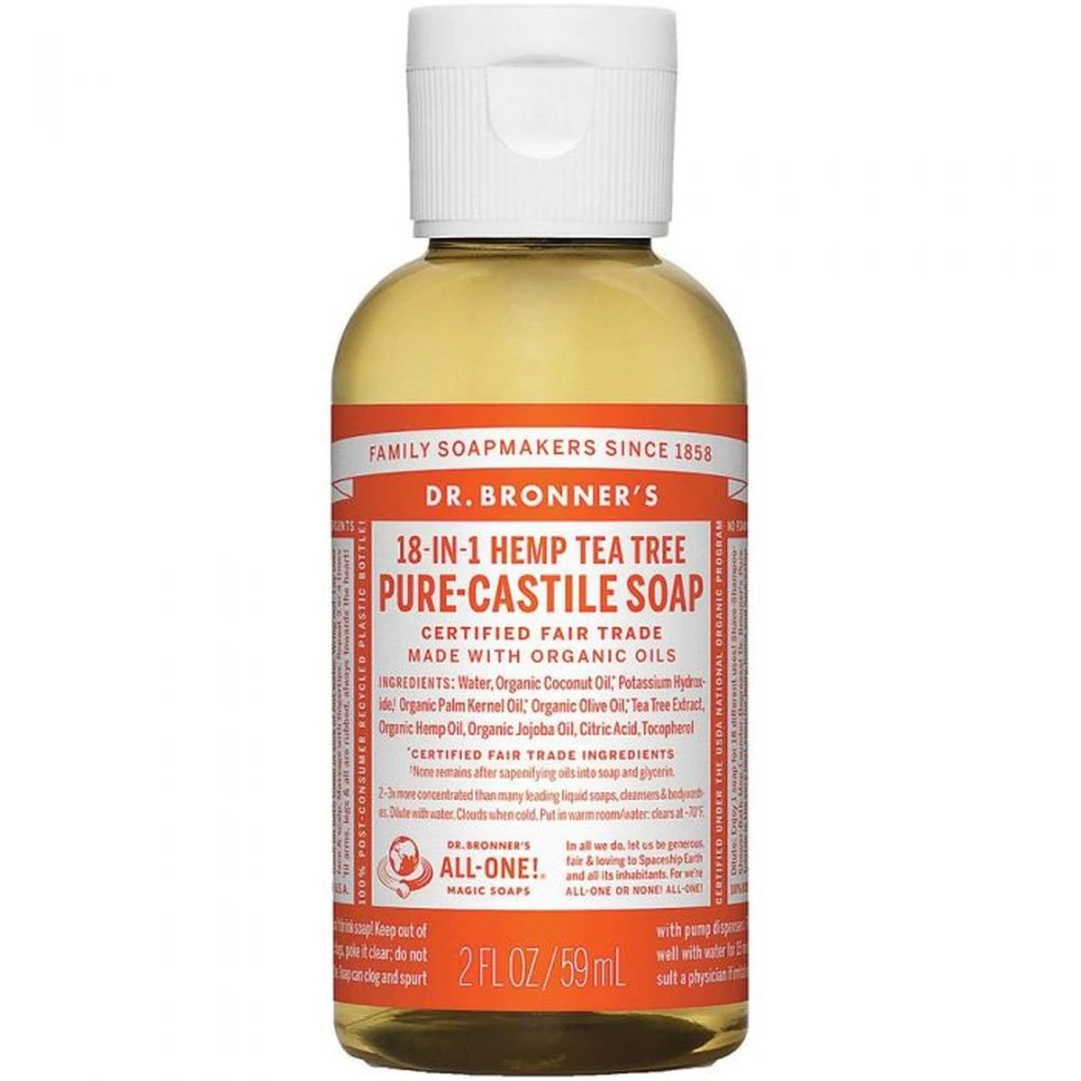 Dr. Bronner’s Tea Tree Castile Liquid Soap is made with pure organic tea tree oil and is also certified Fair Trade. Packaged in 100% post-consumer recycled (PCR) plastic bottles.