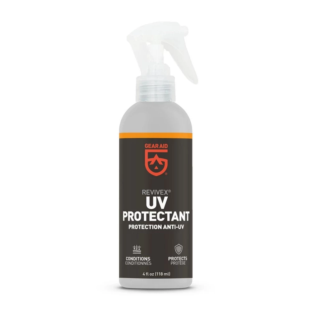 Revivex UV Protectant shields outdoor gear from harmful UV rays. Sunlight can really damage a tent or kayak. Whether it’s made of nylon fabric, plastic, rubber, or fiberglass the sun’s UV rays can break it down fast. Previously known as UV Tech, apply it to anything used outside to prevent cracks and colors from fading. This specialized formula restores gear to its original appearance by replacing lost plasticizers, rejuvenating surfaces and brightening colors. When a sunscreen for gear is needed, apply Revivex UV Protectant before or after sun exposure to keep it looking good.