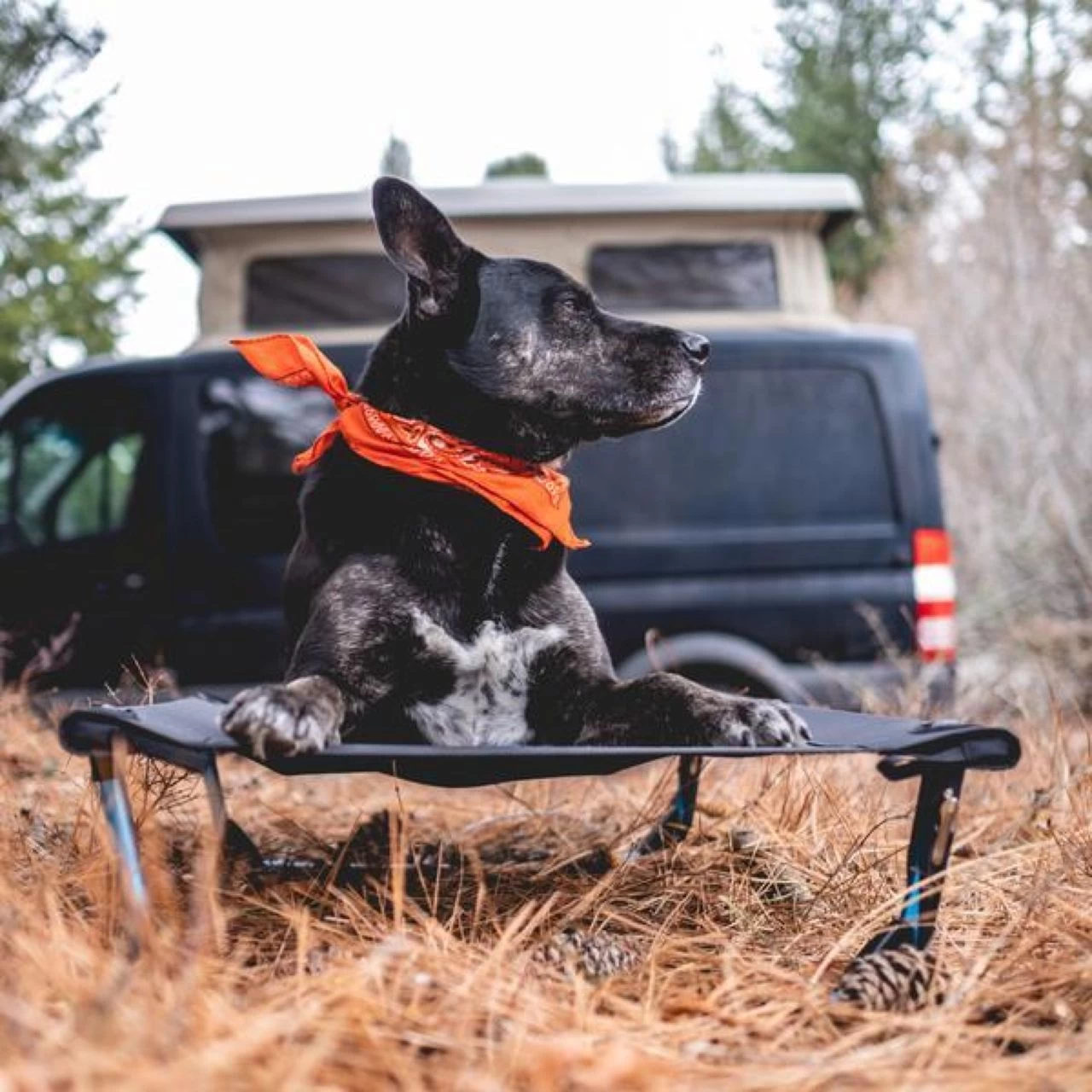 The Helinox Elevated Dog Cot for camping is a raised dog bed to keep your furry best friend comfortable. Monofilament mesh decking keeps them cool and the wide base prevents tipping. Try this dog camping cot today!