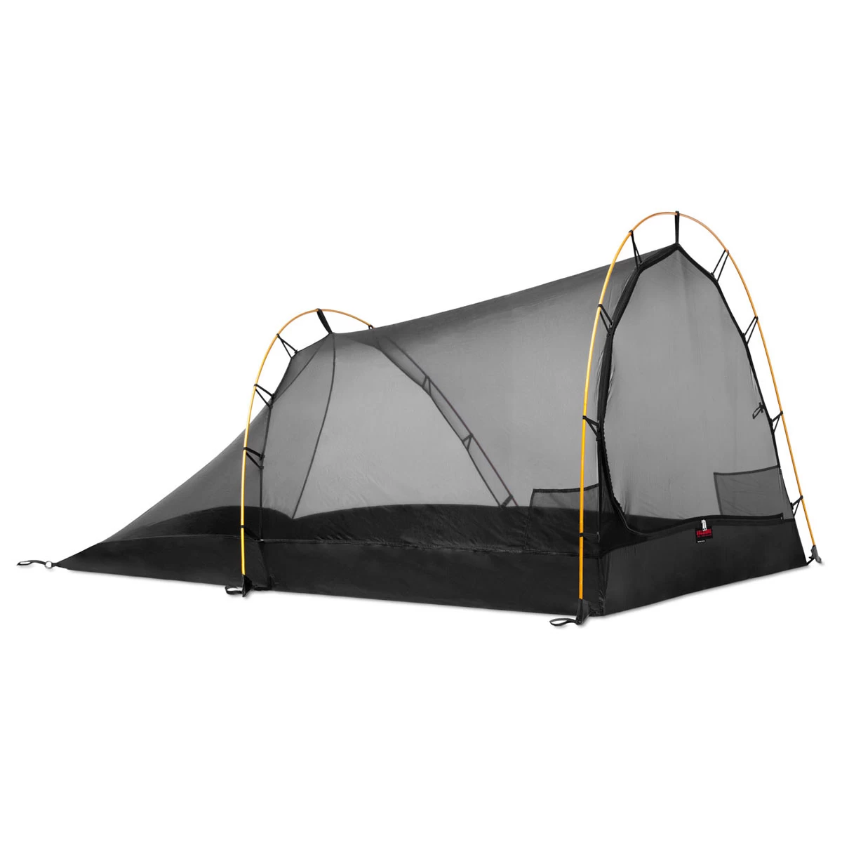 The Hilleberg Nallo 2 Mesh Inner Tent can be used in place of the standard inner tent that comes with the Nallo 2 and Nallo 2 GT: simply disconnect the standard inner tent and button in the Mesh Inner Tent. Used alone, the mesh inner is a simple, highly versatile option for use in dry, warm conditions. Its full mesh walls provide not only maximum airiness and protection from flying and crawling insects, but also 360° views. When used in combination with a Hilleberg Tarp (sold separately), the mesh inner retains all of its venting and viewing advantages while the Tarp provides protection from rain or shade from the sun.