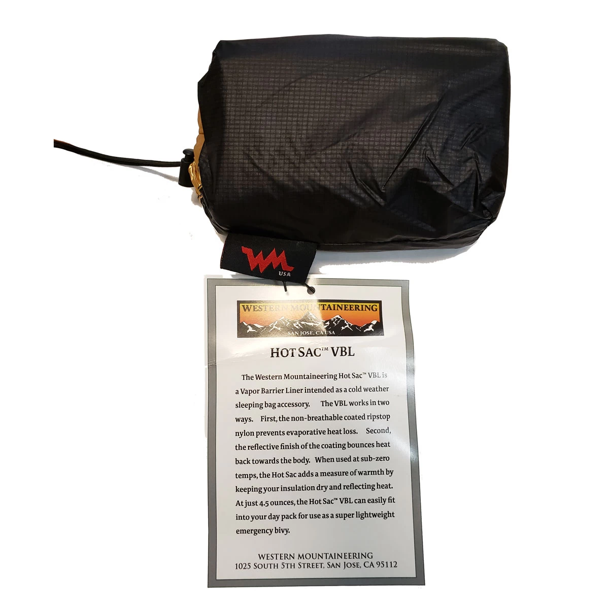 The HotSac VBL is your most important companion for those technical winter trips. A vapor barrier liner (VBL) works by stopping heat loss from evaporative cooling. A VBL will also prevent your body vapor from degrading your insulation. This is most important during extended stays inside your bag. The HotSac VBL goes one step further by stopping radiant heat loss with its reflective metal coating. An elastic drawcord at the top of the HotSac cinches around your neck to prevent convective heat loss. The proprietary fabric is an updated lightweight ripstop. The HotSac weighs only 4.5 ounces and is light enough to carry on day trips as an emergency bivy.