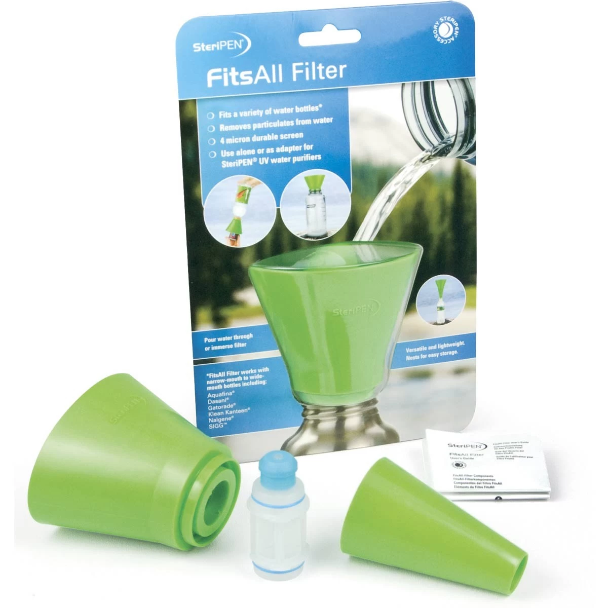 The SteriPEN FitsAll Filter effectively removes particulates from water with the use of a durable 40×40 micron screen. Its unique design, featuring the filter cup and funnel fit, offers flexibility to filter water into bottles with a wide range of mouth sizes, including narrow-mouth bottles such as commercial water bottles, soft-drink bottles, canteens and SIGGâ„¢ bottles. On wider-mouth bottles, such as Klean Kanteen®, Gatorade® and Nalgene® bottles, only the cup is necessary.