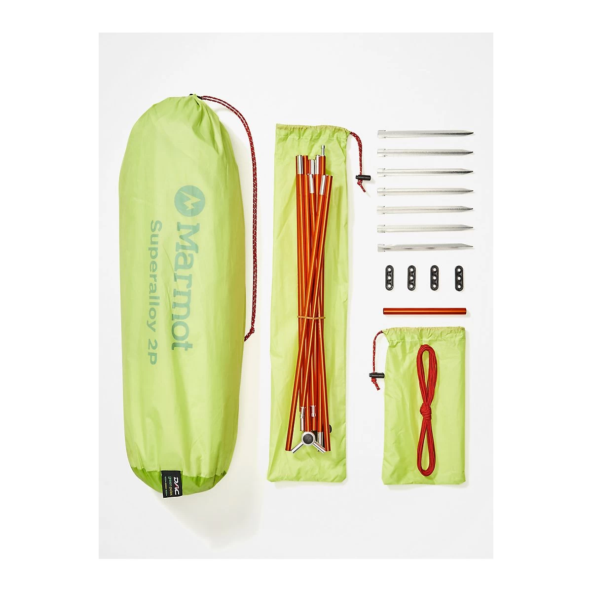 The semi-freestanding Marmot Superalloy 2P tent is ultralight, yet still has the premium features you need to make your campsite the ultimate home away from home. Its vertical walls provide plenty of sleeping space, while the strategic clip placement offers more interior volume for stretching out. If the forecast turns, the rain-shield flysheet won’t stretch out after it gets wet, plus it resists UV damage. Its vented seam-taped full-coverage fly and bathtub floor provide additional weather protection. Color-coded “easy pitch” clips and poles make it easy to set up quickly. Stash your pack, poles, and other gear in the two vestibules and tuck a headlamp into the UV lampshade pocket.