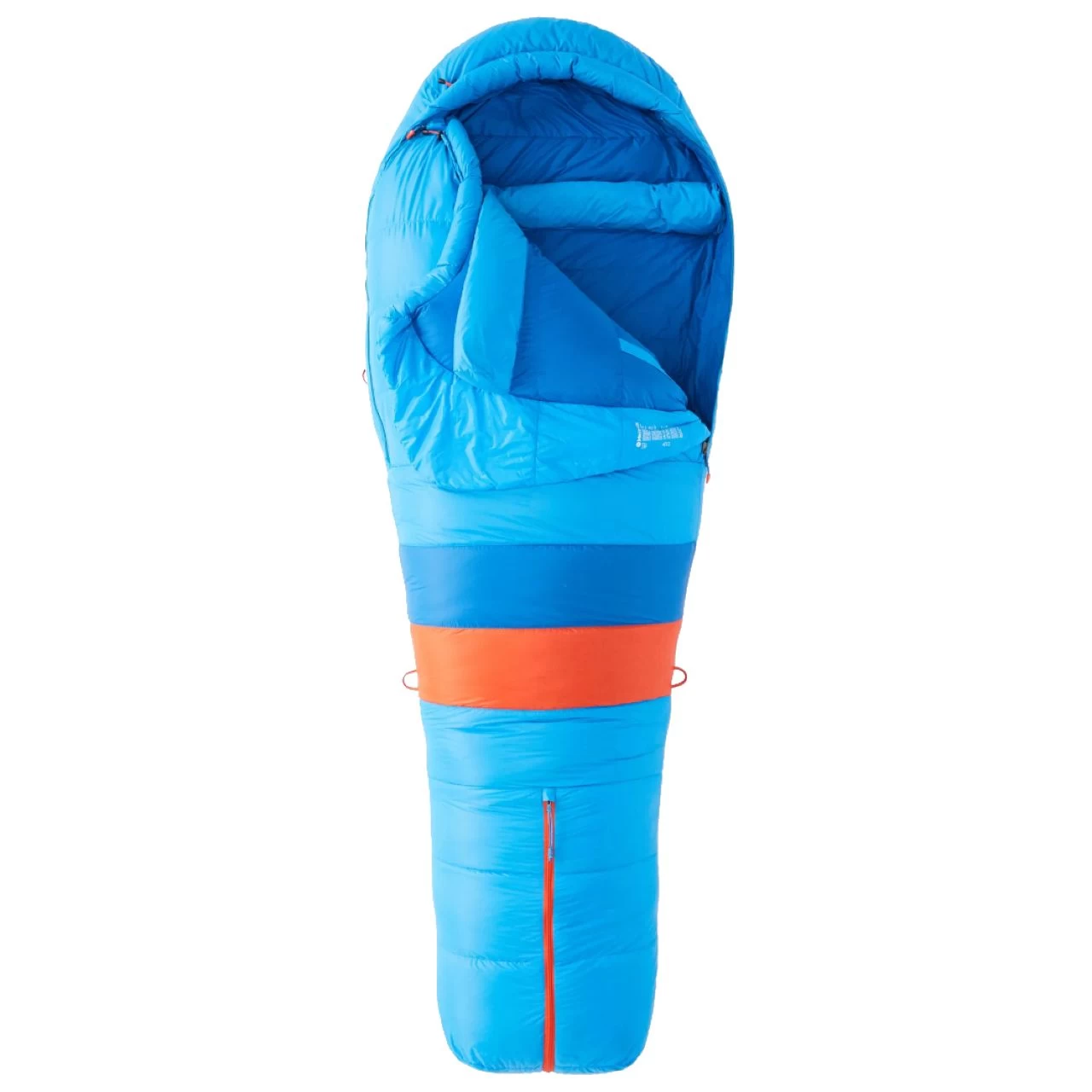 Dropping temps? No worries. The Marmot Wind River -10F sleeping bag is stuffed with 650-fill-power down to keep you nice and toasty. Features like a down-filled draft collar plus a multi-baffled hood team up to prevent heat loss, and dual-side zips let you regulate the temp while making it easy to climb in and out of the bag. Looking for more room? Open the footbox for space to stretch or zip it up for extra warmth. Unzip the extended zipper flaps on extra-cold nights for blanket-like coverage.
