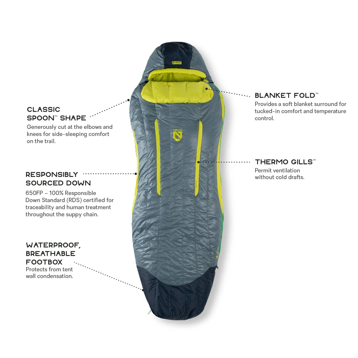 Updated with new contours, the NEMO Disco 30 continues to reign as the ideal down backpacking bag for side-sleepers, offering the plushest comfort possible on the trail.