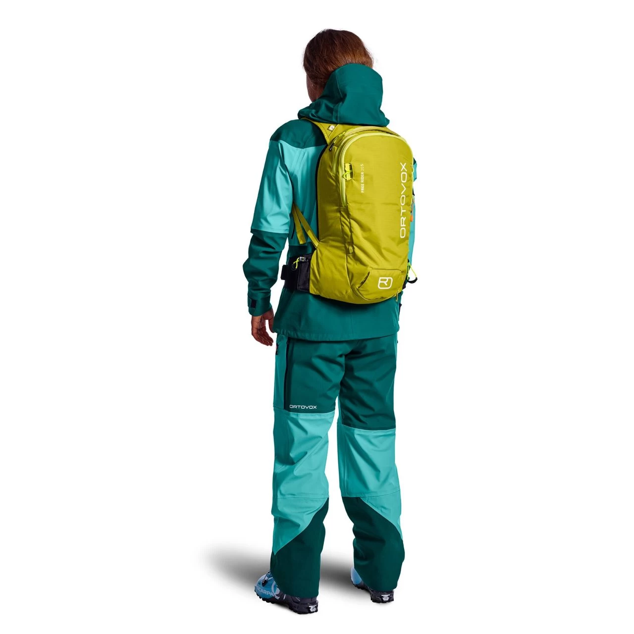 The Ortovox Free Rider 20 S fits extra snugly against the back when freeriding in any terrain – just like a second skin This is primarily down to the flat, elasticated Clasp Flex Belt which provides control in every situation as well as reliable support. The soft back pads hug the back perfectly without restricting the movements of the spine. On the inside, the back of the backpack can be fitted with the Clasp Spine Protector (sold separately). This spine protector is certified to motorcycle standards and can be purchased separately. It slides easily into a separate inner pocket. The focus here is both on your safety and on the environment: This freeriding backpack is completely PFC-free and, thanks to the use of recycled polyester, also climate-neutral.