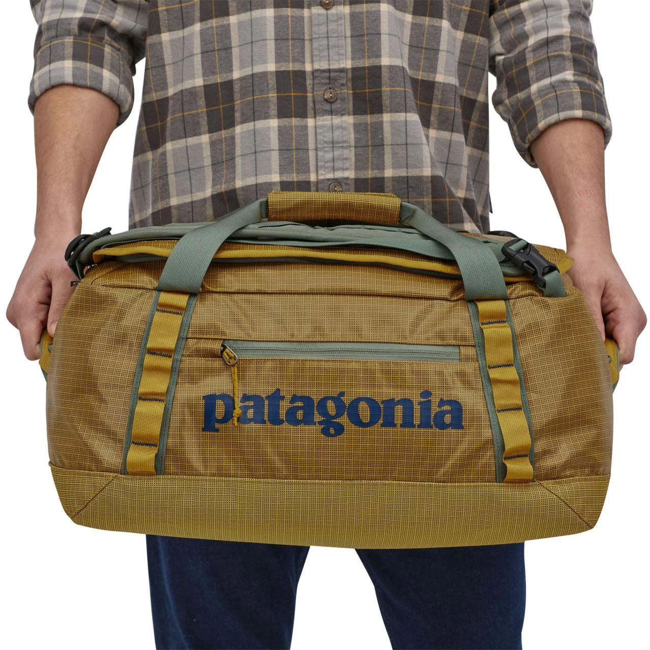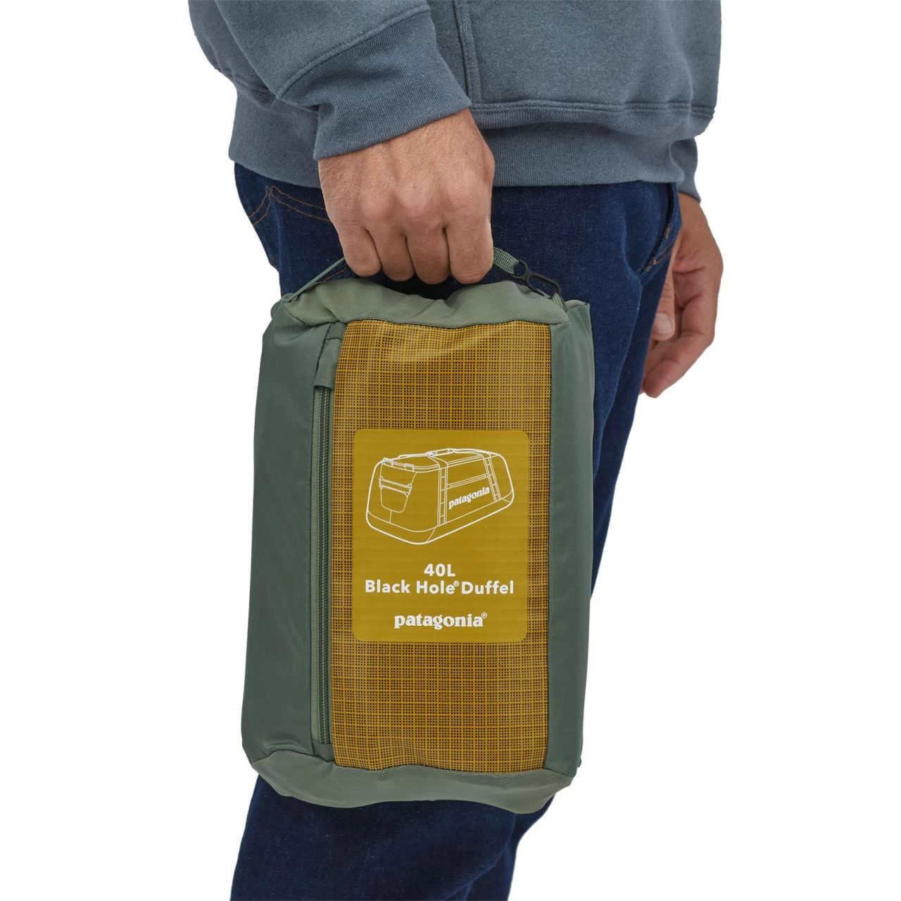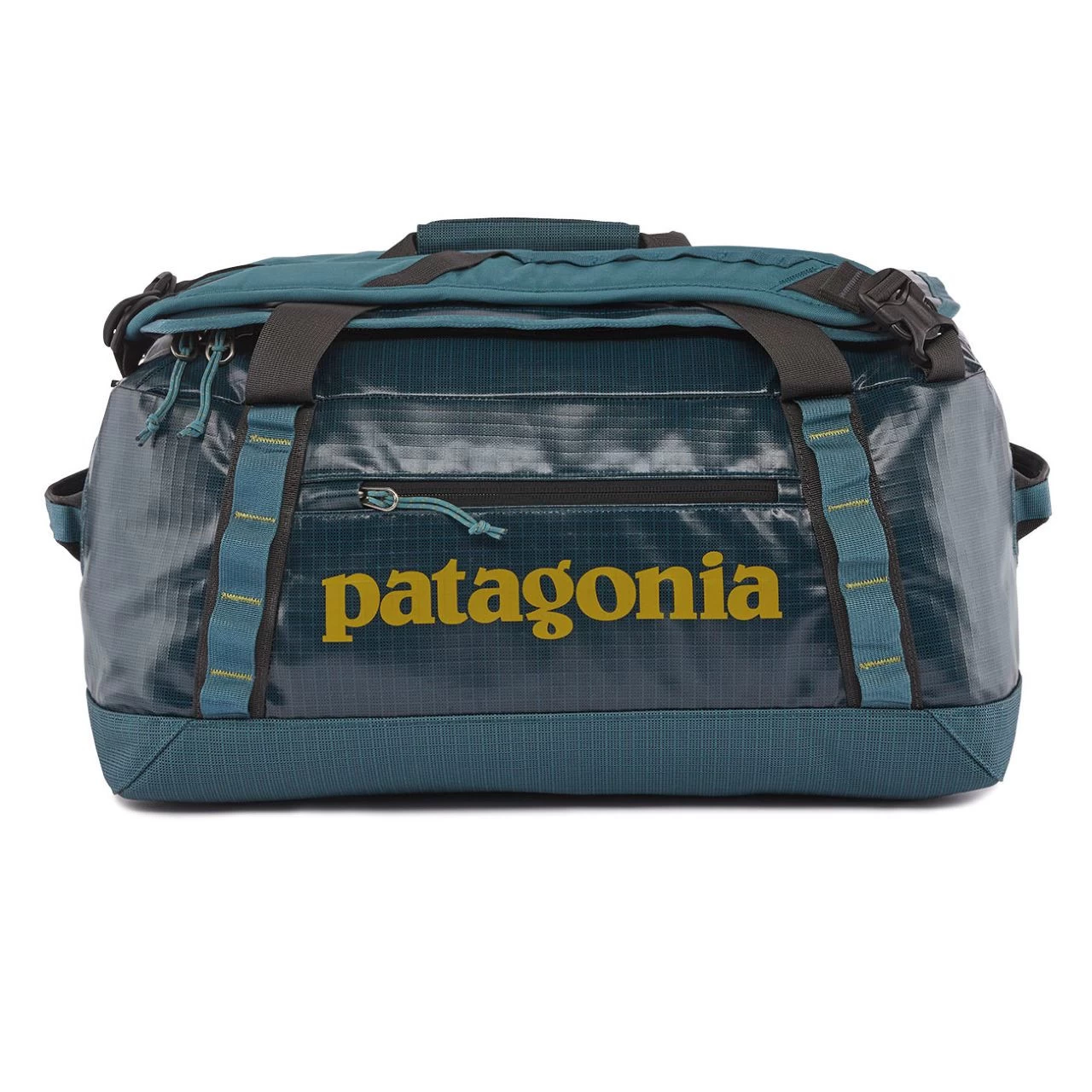 The Patagonia Black Hole Duffel Bag 40L is the smallest of the Black Hole collection. Tough and highly weather-resistant, it keeps your gear protected and easily accessible. The main compartment opens via a zippered U-shaped lid, which has a pair of zip-closing mesh pockets on the underside for easily lost items like your lottery ticket. A zippered exterior pocket holds all the stuff you need quickly. The padded bottom panel adds structure and helps cushion the load when your duffel gets the baggage-handler treatment. Carrying options include padded, removable shoulder straps for a backpack carry, webbing handles with a snap closure, and haul loops at either end for linking multiple bags. Daisy chains let you lash additional gear to the outside. Made from burly, 900-denier 100% postconsumer recycled polyester ripstop with a TPU-film laminate and lined with 200-denier 100% recycled polyester with a polyurethane coating. Both fabrics have a DWR (durable water repellent) finish.