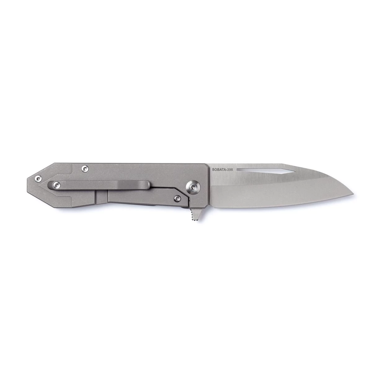This simple, yet classy design serves as the ultimate everyday carry knife. The combination of the satin-finished sintered titanium blade and the blasted titanium handle creates a classic-looking knife that feels practically weightless in the hand. The single-position titanium clip allows the knife to be conveniently attached to a belt loop or pocket for easy access. The modified sheepsfoot blade, along with the superb edge retention of the sintered titanium, has an excellent balance of form and function. The Sobata 398 is the perfect knife to take on long backpacking expeditions, to include in a tackle box for weekend fishing trips, or even just to be a centerpiece to an amazing collection.