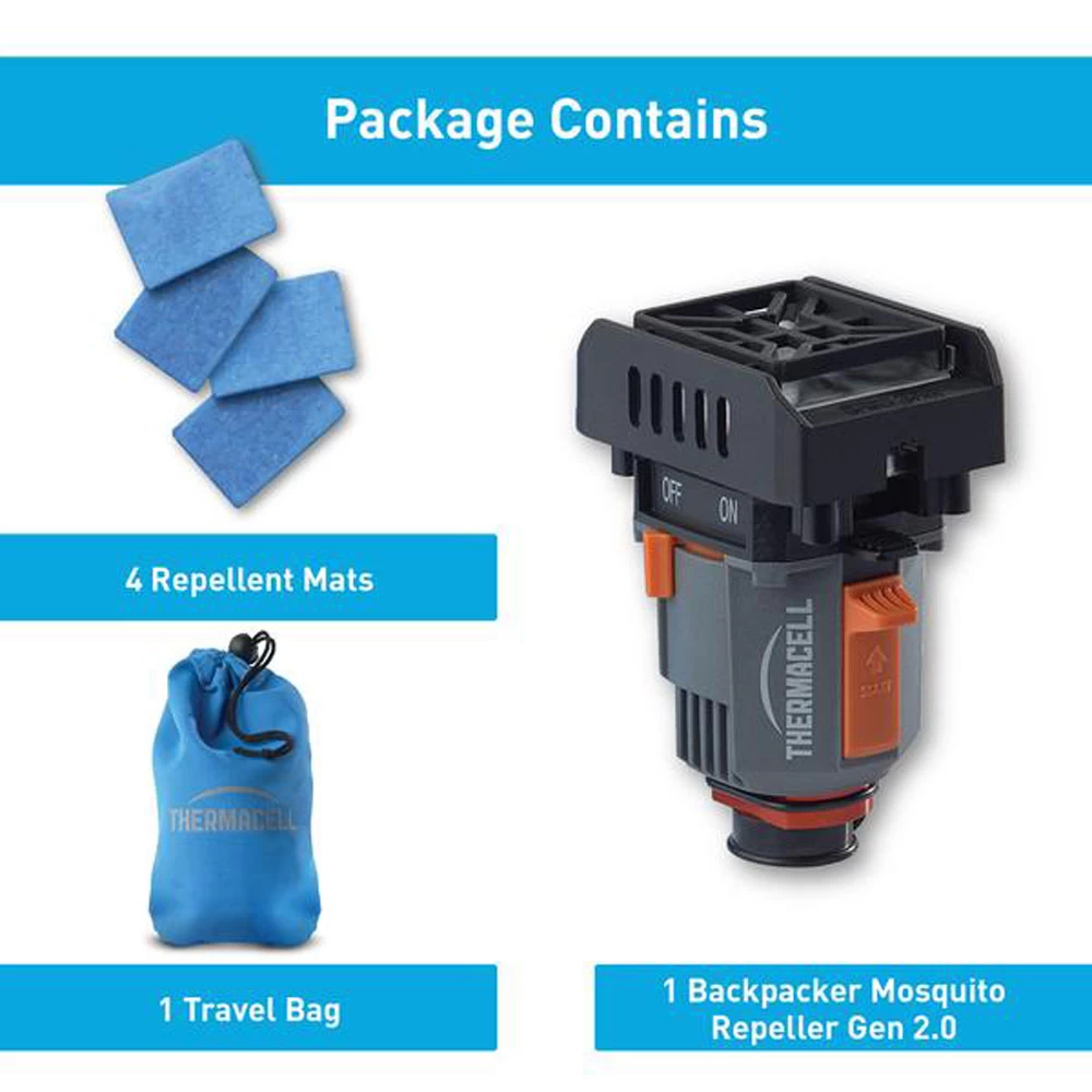 • Package contains: 1 Backpacker Repeller, 16 hours of repellent (4 repellent mats lasting 4 hours each), and 1 water-resistant travel bag. Requires camping gas canister (not included)