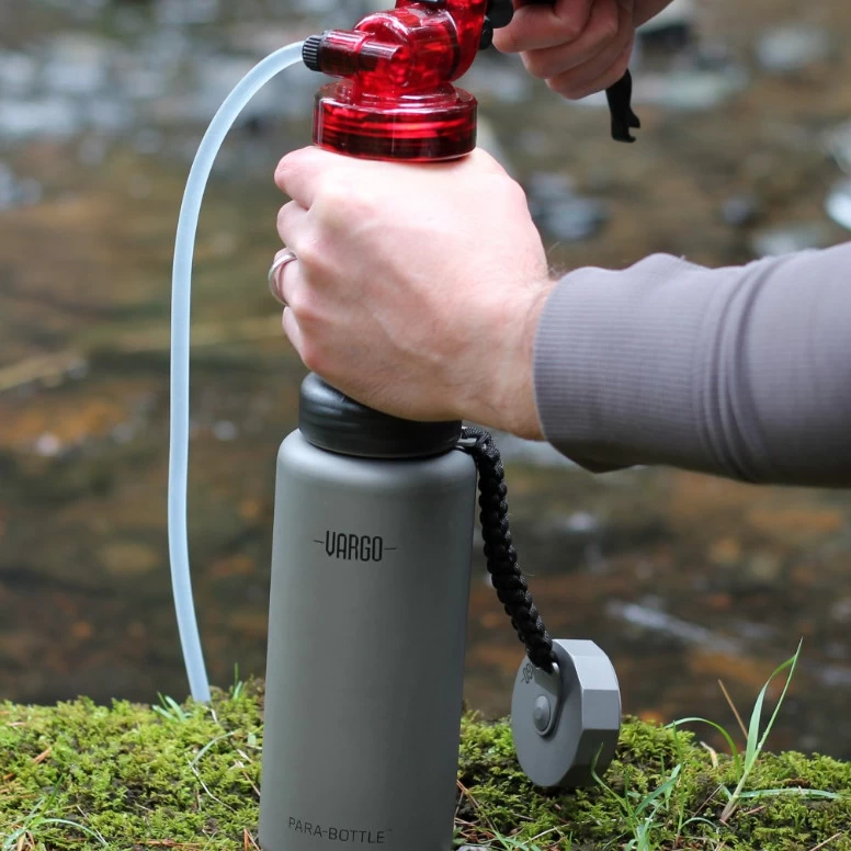 The ultralight Titanium Para-Bottle from Vargo is a completely biocompatible 1 liter water bottle which won’t leach or corrode, and works with common water filters. It features 7 feet of integrated replaceable 550 paracord, individually machined decagon shaped lid, and pure titanium construction. When you find yourself in over your head, unwind the 7 foot paracord carry loop and pull yourself out to safety, improvise fishing line, make a bow drill, splint your broken tent pole, or your leg. It’ll be there when you need it most.